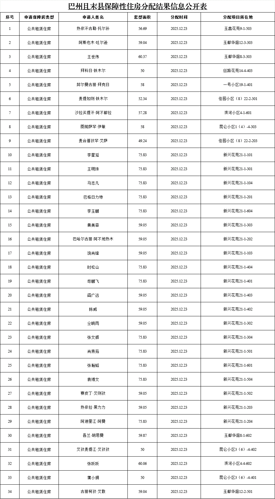 巴州且末县保障性住房分配结果信息公开表