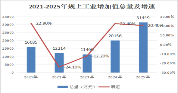 2025年规模以上工业企业10家,全年实现工业增加值31449万元,比上年增长20.4%,全县规模以上工业企业分门类看,采矿业累计实现增加值21496.48万元,同比增长38.2%;制造业累计实现增加值1062.69万元,同比增长21.68%;电力、热力、燃气及水生产和供应业累计实现增加值8890.06万元,同比下降2.94%。
