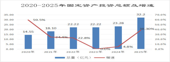 2025年全年完成全社会固定资产投资额(不含农户)321969万元,同比增长38.3%,其中:建筑安装工程同比增长64.9%,设备工器具购置同比下降56.1%,其他费用同比下降49.5%。分产业看,第一产业同比增长78.5%,第二产业同比增长50.1%;第三产业同比增长3.7%。分领域看,工业投资占比达49.1%,同比增长50.1%;基础设施投资领域同比增长26.8%,其中交通运输、仓储和邮政业增长6.6%;社会民生投资持续回落,同比下降29.2%,其中卫生和社会工作行业投资下降23.1%,房地产开发投资下降37.8%。