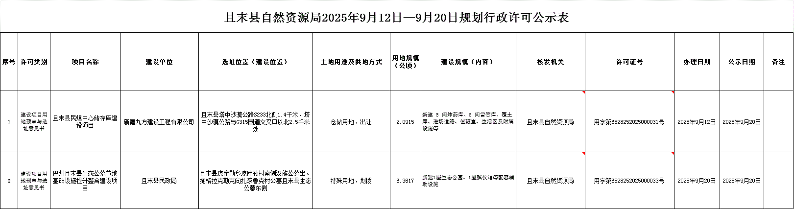 且末县自然资源局2025年9月12日—9月20日规划行政许可公示表