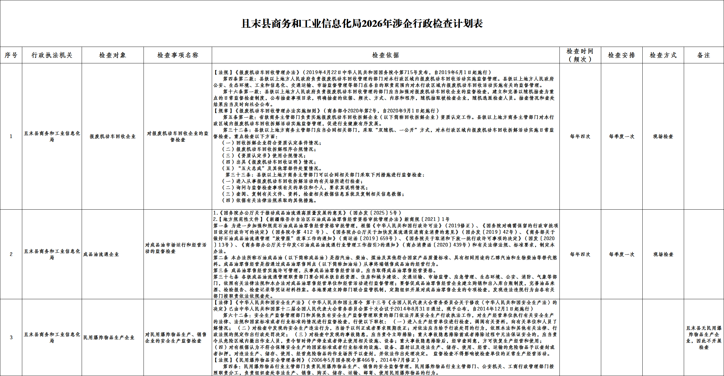 且末县商务和工业信息化局2026年涉企行政检查计划表