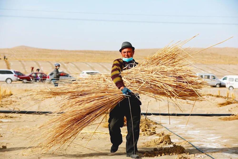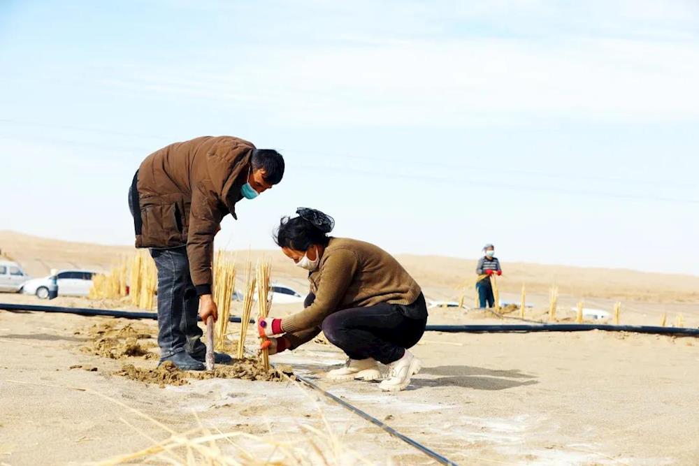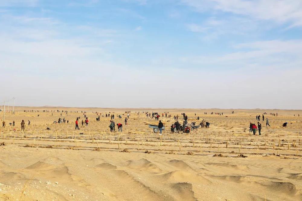 琼库勒乡琼库勒村村委会副主任亚库普江·托乎提告诉记者:“我们村分了三百多亩地,今天组织了170多名农民群众参加植树,我们先种了梭梭,后面种大芸,既能改善环境又能增加收入,农民群众都很有积极性。”