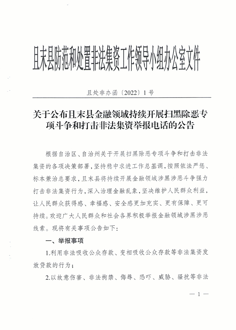 关于公布且末县金融领域持续开展扫黑除恶专项斗争和打击非法集资举报电话公告