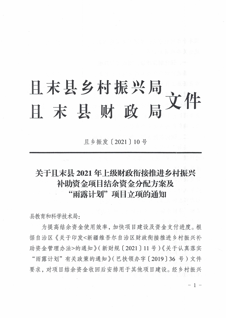 且末县2021年上级财政衔接推进乡村振兴补助资金项目结余资金分配方案及“雨露计划”项目立项公示告