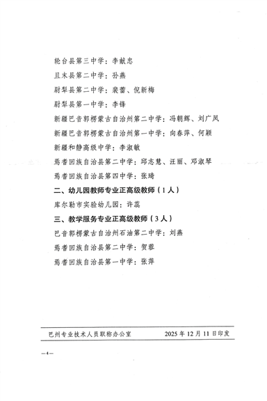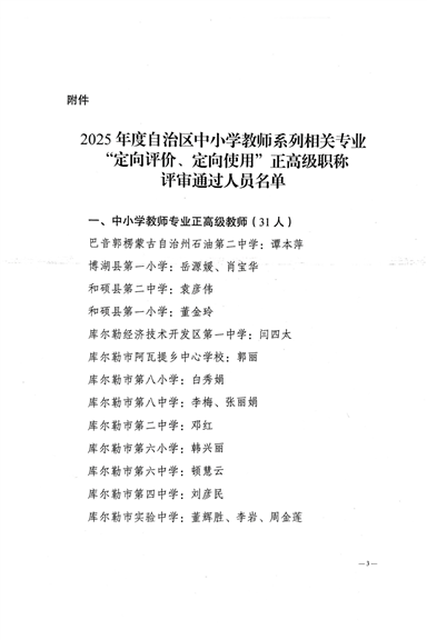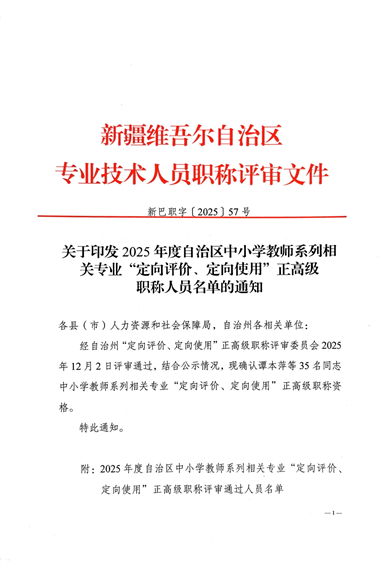 关于印发2025年度自治区中小学教师系列相关专业“定向评价、定向使用”正高级职称人员名单的通知 新巴职字〔2025〕57号