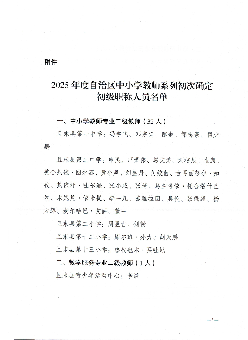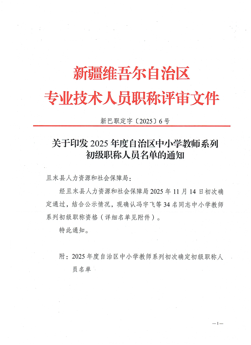 关于印发2025年度自治区中小学教师系列初级职称人员名单的通知 新巴职定字〔2025〕6号