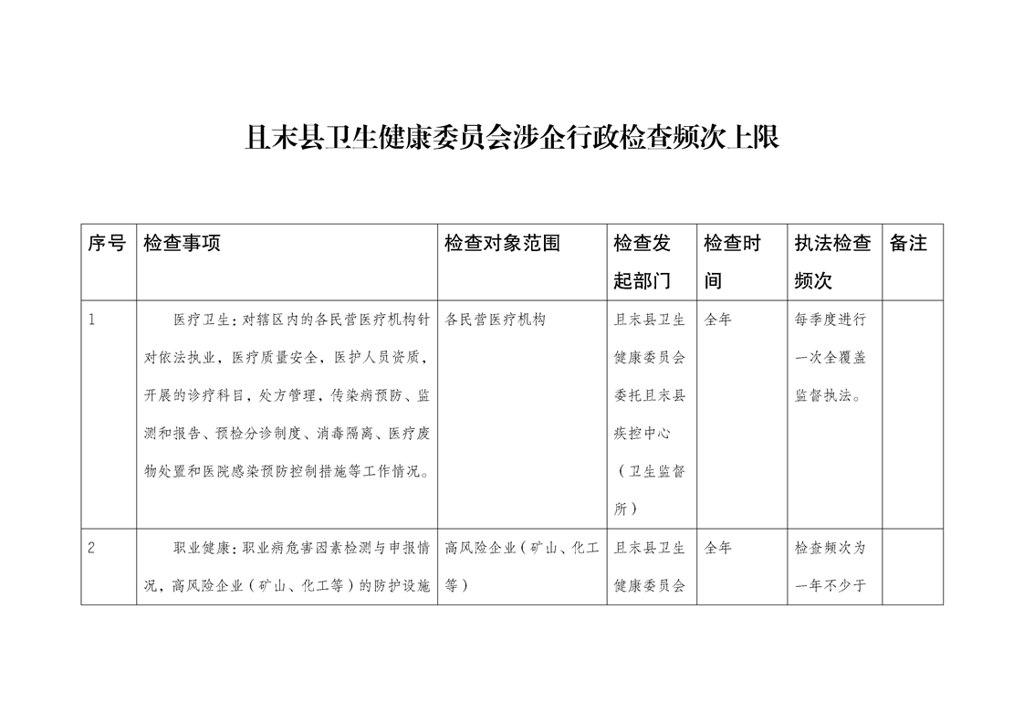 且末县卫生健康委员会涉企行政检查频次上限