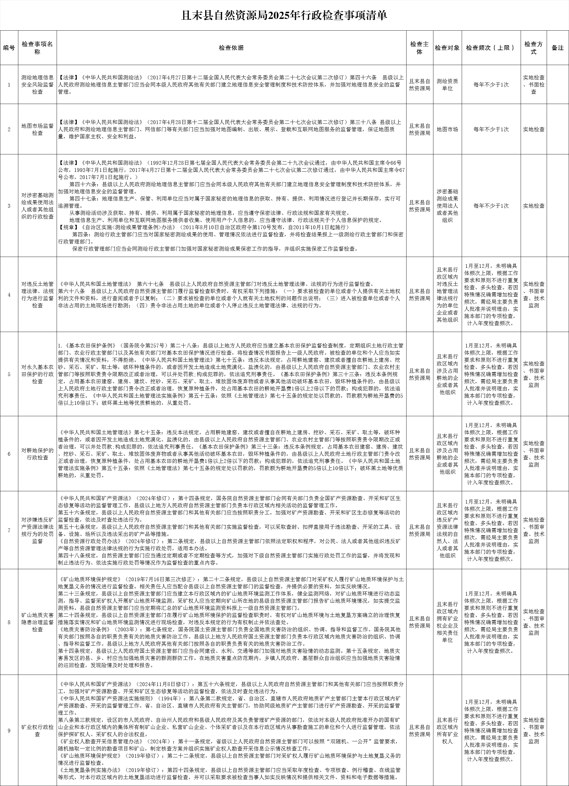 且末县自然资源局2025年行政检查清单